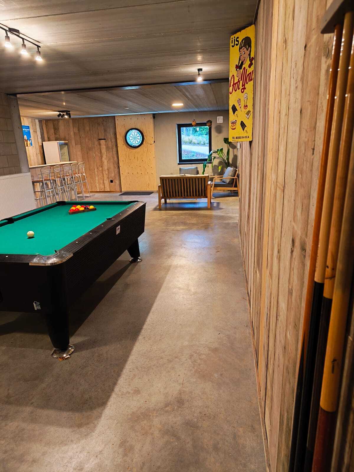 - Het hele huis is onderkelderd. Daarin huist een bijzonder grote hobbyruimte — onze "family cave" — met een toog, pooltafel, biljart, dartsbord en speelruimte voor kindjes. Voldoende ruimte dus voor veel vertier in het ruime souterrain.